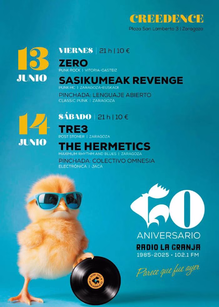 ![]() En Radio la Granja seguimos celebrando nuestro 40 aniversario . Para ello, este fin de semana os hemos preparado un menú muy especial: - Viernes 13 de junio , Sala Creedence, y en colaboración con Zaragoza Desorden: ZERO + SASIKUMEAK REVENGE, pinchada a carga del programa Lenguaje Abierto (lunes 21:000h) - Sábado 14 de junio , Sala Creedence: TRE3 + THE HERMETICS, pinchada |