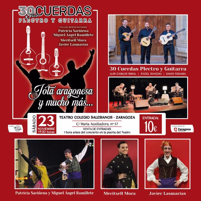 El sábado 23 de noviembre de 2024, a las 19:30 horas, en el Teatro del Colegio SALESIANOS de Zaragoza (c/ María Auxiliadora, no 57), el trío musical «30 CUERDAS Plectro y Guitarra» presenta su nuevo proyecto: JOTA ARAGONESA Y MUCHO MÁS, un concierto-espectáculo de música aragonesa y jota que nos hará viajar a través de los sentidos con la música aragonesa interpretada con bandurria, laúd y guitarra como hilo conductor.