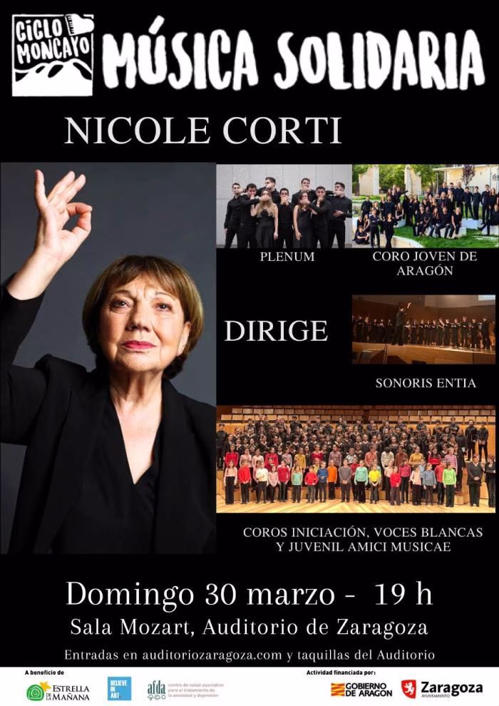 Nicole Corti, El domingo 30 de marzo a las 19 horas, en la Sala Mozart del Auditorio de Zaragoza, dirigirá los Coros Iniciación, Voces Blancas y Juvenil Amici Musicae, Sonoris Entia, Plenum y el Coro Joven de Aragón.