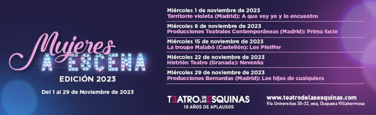 El Teatro de las Esquinas presenta la 7ª edición del ciclo «Mujeres a Escena». Una iniciativa que nació para dar cabida a nuevas voces teatrales donde lo femenino es una de sus características comunes y que se ha consolidado como uno de los grandes eventos artísicos-culturales reivindicativos de una sociedad más justa e igualitaria.