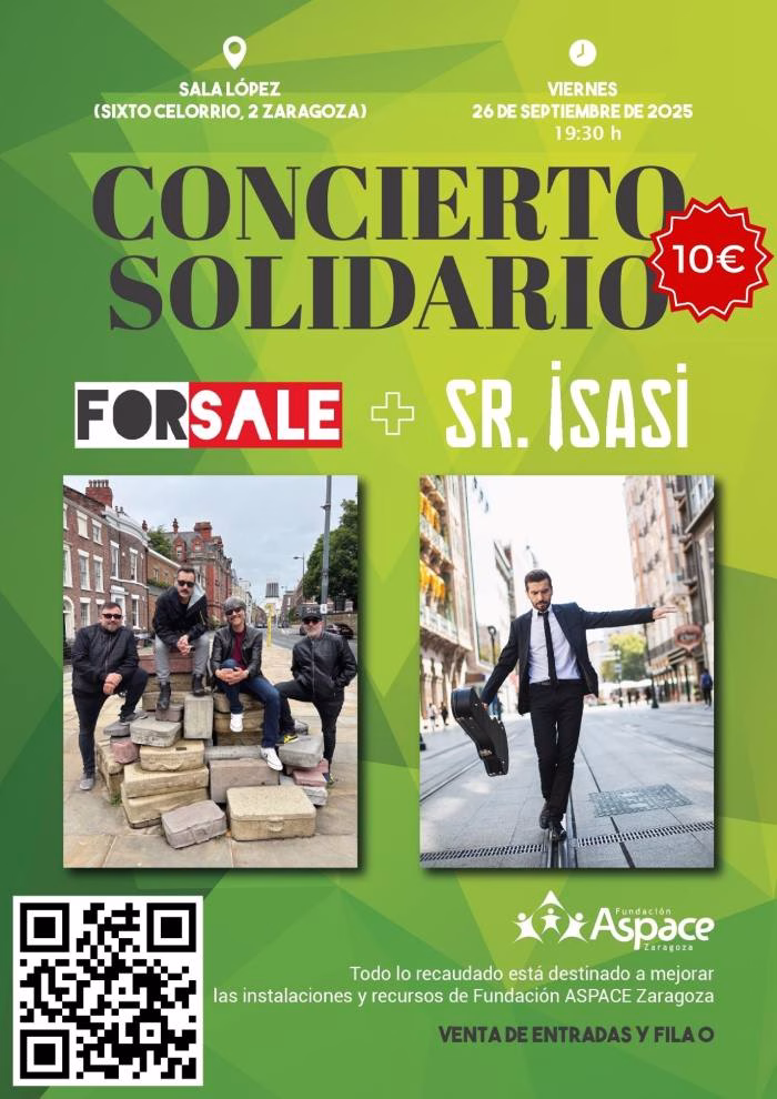 Fundación Aspace Zaragoza pone en marcha una nueva cita musical solidaria con la participación altruista del grupo zaragozano For Sale y el músico Sr. Isasi. El concierto se celebrará el viernes 26 de septiembre, a las 19:30 horas, en la Sala López de Zaragoza, uno de los escenarios de referencia de la ciudad.