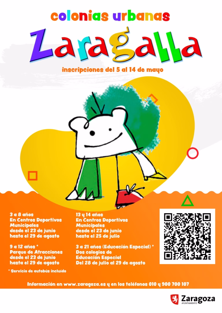 Este lunes 5 de mayo se ha abierto el plazo de inscripción para las colonias urbanas de verano Zaragalla, organizadas por el Área de Políticas Sociales del Ayuntamiento de Zaragoza. Las solicitudes deben formalizarse a través de la web municipal www.zaragoza.es.