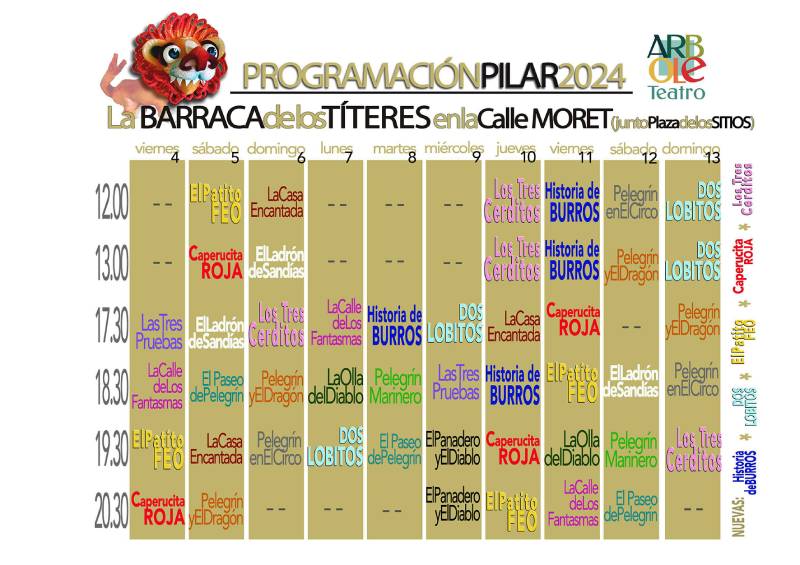 Como ya es tradición desde hace casi tres décadas, la Barraca de los Títeres del Teatro Arbolé saldrá a la calle en las fiestas del Pilar para hacer las delicias del público infantil y familiar. Será en la carpa de la calle Moret (junto a la plaza de los Sitios), con programación del 4 al 13 de octubre. Teatro Arbolé realizará un total de 47 funciones de 15 obras diferentes. Este año, como novedad, también se representarán algunos de los célebres cuentos clásicos de Arbolé, como “Los tres cerditos”, “Caperucita Roja” ”El patito feo” o “Dos lobitos”.