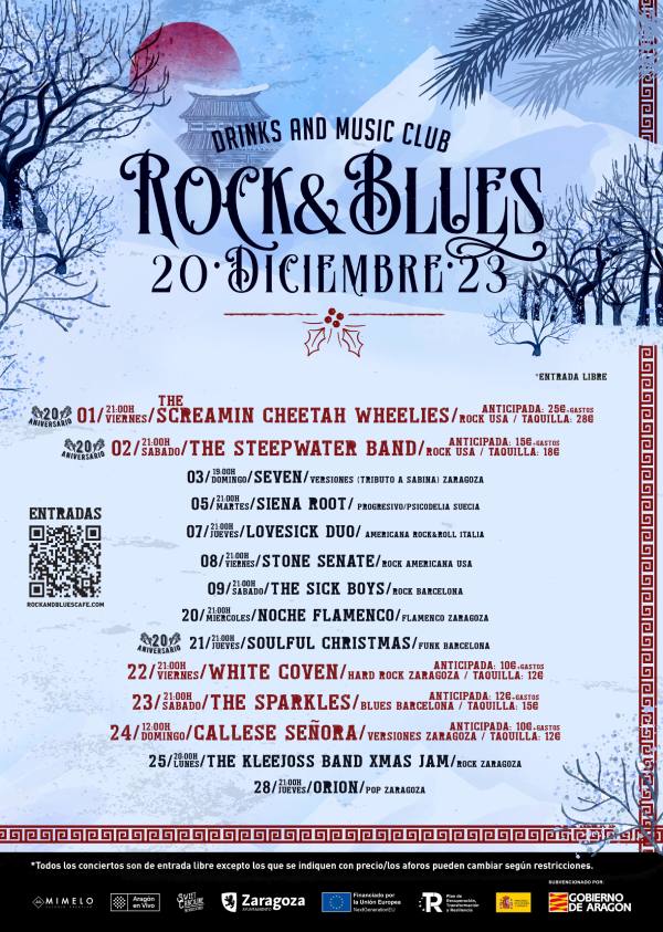 Por primera vez, el Rock & Blues ha organizado un vermú de Nochebuena: Cállese señora actuará el domingo 24 a las 12h. Los fans de Siniestro Total podrán disfrutar de este grupo tributo la mañana de Nochebuena. El día de Navidad a las 20h es el turno de The Kleejoss Band Xmas Jam. Vuelve el tradicional Xmas Show del Rock & Blues tras la pandemia. Tiene entrada libre y habrá muchas sorpresas.