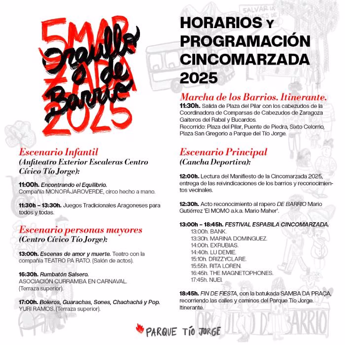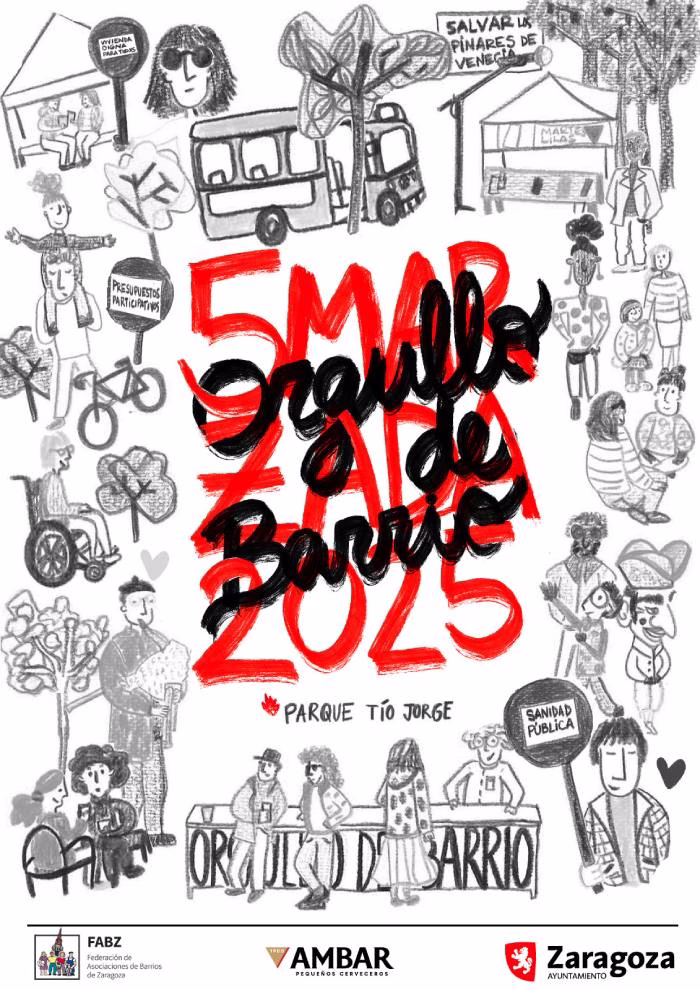 El lema elegido este año por la FABZ es ‘Orgullo de barrio’, con el que quieren lanzar un grito de reconocimiento a los barrios en la vida cotidiana de la ciudad, y a la labor de las entidades vecinales y a su trabajo colectivo por mejorar la ciudad. A su llegada, y en el escenario principal ubicado en la cancha de baloncesto, los representantes de las asociaciones vecinales leerán a las 12.00 horas el manifiesto de la Cincomarzada y entregarán sus reivindicaciones a los representantes del Ayuntamiento.