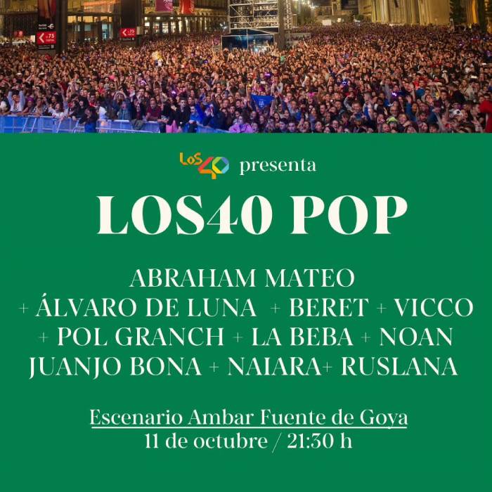 Ya se conocen los artista que actuarán en Los40 pop del Pilar 2024 y no te lo puedes perder. Los40 pop serán uno de los platos fuertes de estas Fiestas del Pilar. La Plaza del Pilar se llenará como en los últimos años de los mejores cantantes y grupos españoles el viernes 11 de octubre a las 21:30 dentro de los conciertos gratuitos de las Fiestas del Pilar.