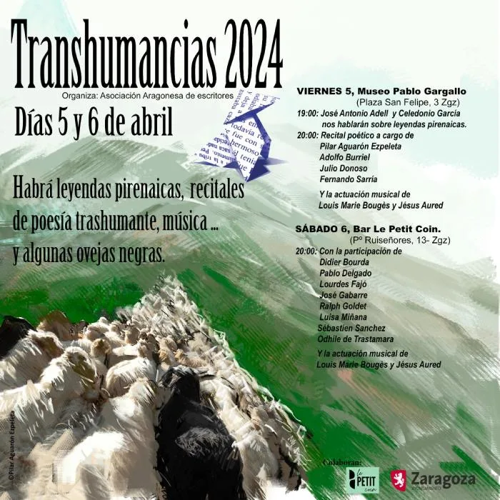 Zaragoza acogerá los días 5 y 6 de abril el VI Festival Transhumancias. Este encuentro cultural entre ambas vertientes de los Pirineos está organizado por la Asociación Aragonesa de Escritores, con la novedad de que, además de centrarse en la poesía, esta edición se abrirá a otras disciplinas como la música o las leyendas, con la colaboración del Ayuntamiento de Zaragoza.