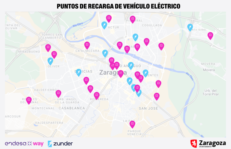 Zaragoza se prepara para dar su gran salto en materia de movilidad eléctrica. A lo largo de las próximas semanas comenzarán diferentes obras de instalación de muchos de los 149 puntos de recarga que estarán distribuidos en 37 ubicaciones por toda la ciudad y que han sido adjudicados a las empresas Endesa X Way y Zunder. Endesa X Way instalará 103 puntos de recarga en 26 ubicaciones, mientras que Zunder se encargará de la construcción de 46 de ellos en 11 ubicaciones.